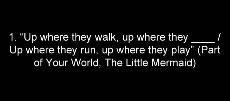 "Up where they walk, up where they ____ / Up where they run, up where they play" (Part of Your World, The Little Mermaid)